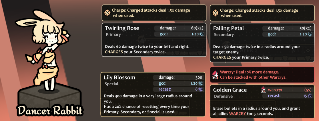 各クラスはプライマリ、セカンダリ、スペシャル、ディフェンシブの4つから成るスキルセットを持ち、それぞれのスキルが相互に作用し合う事でクラスを特徴付けている。スキルによって有効な効果範囲が異なる為、敵の攻撃を掻い潜り、シチュエーションに応じた最適なスキル回しで如何に高いDPSを叩き出すかが攻略の鍵となるようだ。